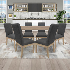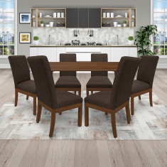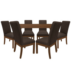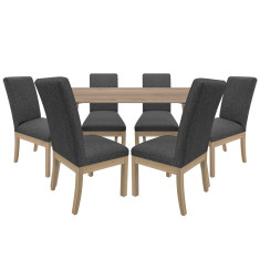 Juego compuesto por una mesa con diseño en líneas rectas y tapa biselada que supera la barrera del tiempo, no pasa de moda y es fácil de combinar en diferentes estilos de decoración. Se complementa con 6 sillas de espaldar y asiento tapizado.