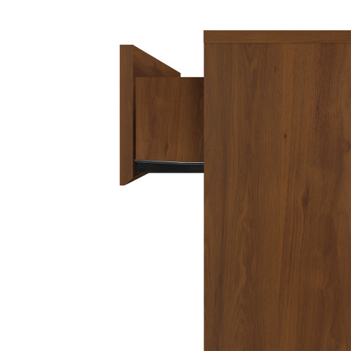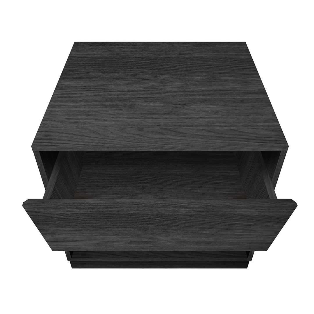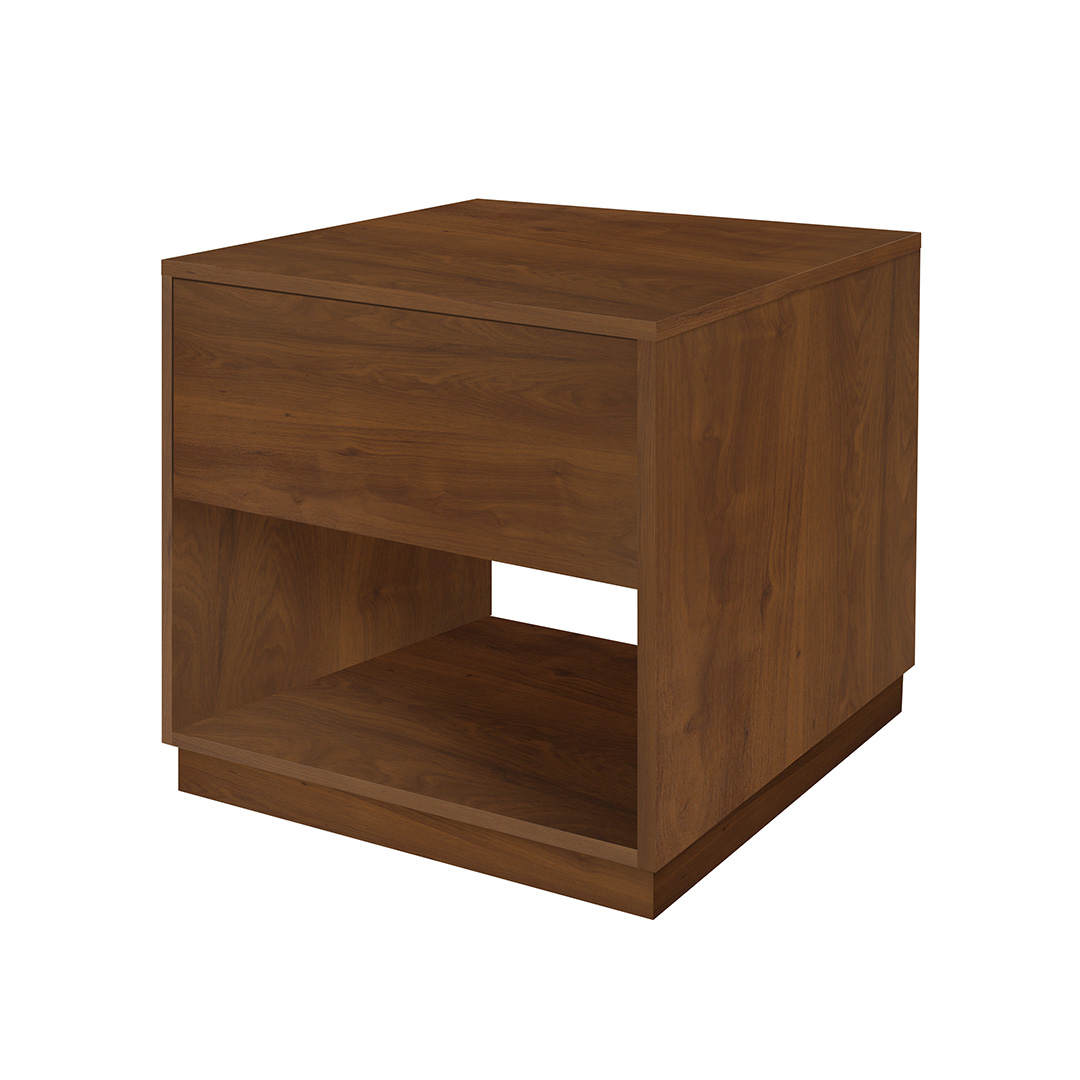 Mesa de noche de estilo moderno en líneas rectas. Tiene un cajón superior con amplio espacio de almacenamiento. Apertura sin manija, la tapa del cajón cuenta con un borde biselado de fácil agarre y desliza con facilidad gracias a un herraje tipo riel. Por su parte inferior dispone de un espacio abierto para almacenaje adicional. Elaborado con materiales de calidad, resistentes y duraderos para que puedas utilizarlo por muchos años.